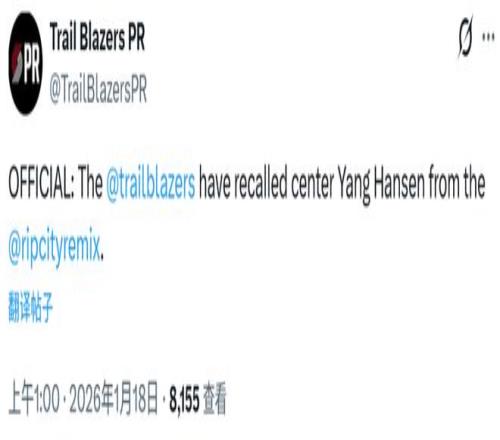 北京时间1月18日,开拓者官方宣布从混音召回了杨瀚森,他有望出战今日主场对湖人的比赛。如果杨瀚森在这场比赛中登场,这将是一次背靠背的比赛。昨日G联赛对阵蓝队,杨瀚森拿到14分17篮板2助攻2盖帽,出现3次失误5次犯规,篮板创G联赛生涯新高。